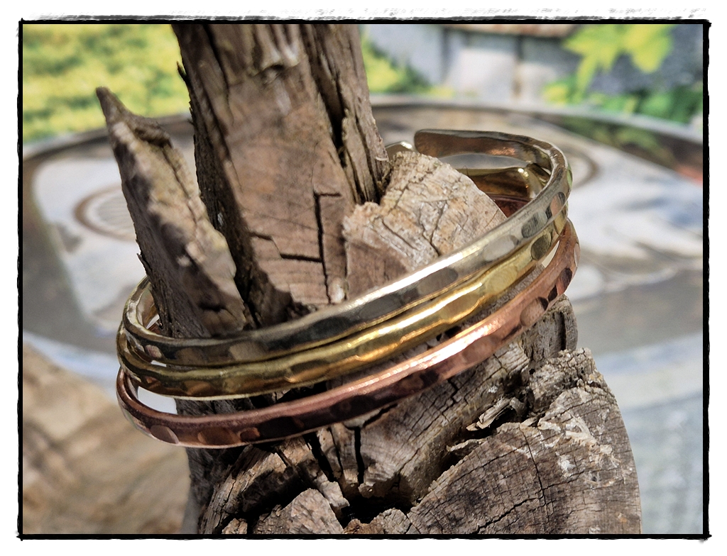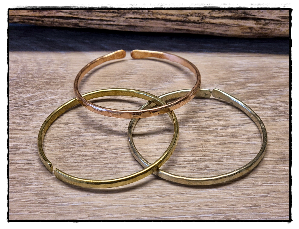 Das Armreifen Dreier Set besteht aus handgefertigten Armbändern aus Kupfer, Weißmetall und Messing. Jeder Armreif besticht durch seine gehämmert wirkende Oberfläche und die natürlich polierte Form, die ihm einen rustikalen, organischen Look verleiht.