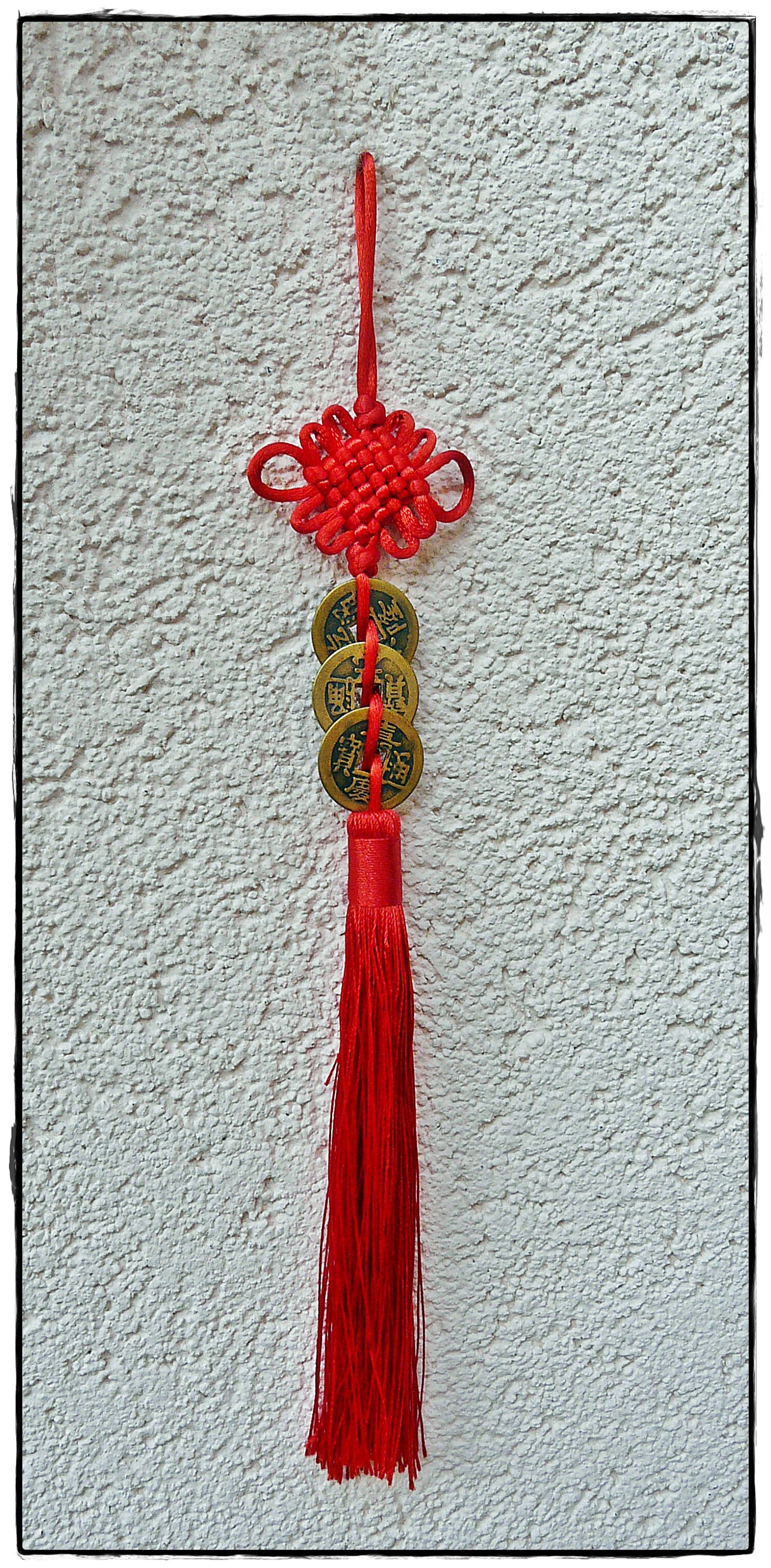 Schnur mit gefädelten Endlosknoten, 3 Münzen + Quaste, Gesamtlänge ca. 26 cm