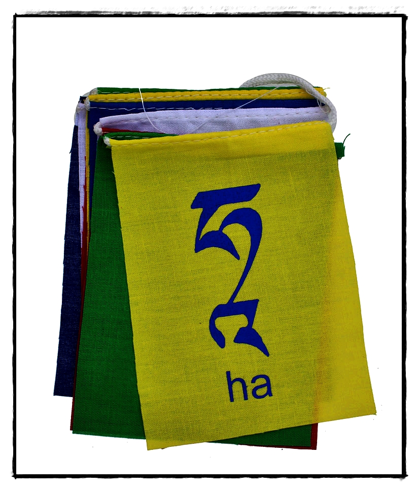 Diese kleine Gebetsfahne kennzeichnet das Mantra des weiblichen Buddha Tara, „Oṃ Tār Tuttāre Ture Svāhā“. Jede Flagge beinhaltet eine Silbe des Mantras.