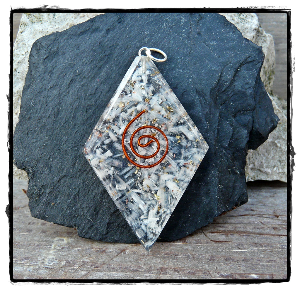 Der Orgonit Anhänger Selenit setzt sich zusammen aus Selenit, Harz und Metall (Spirale aus Kupfer).