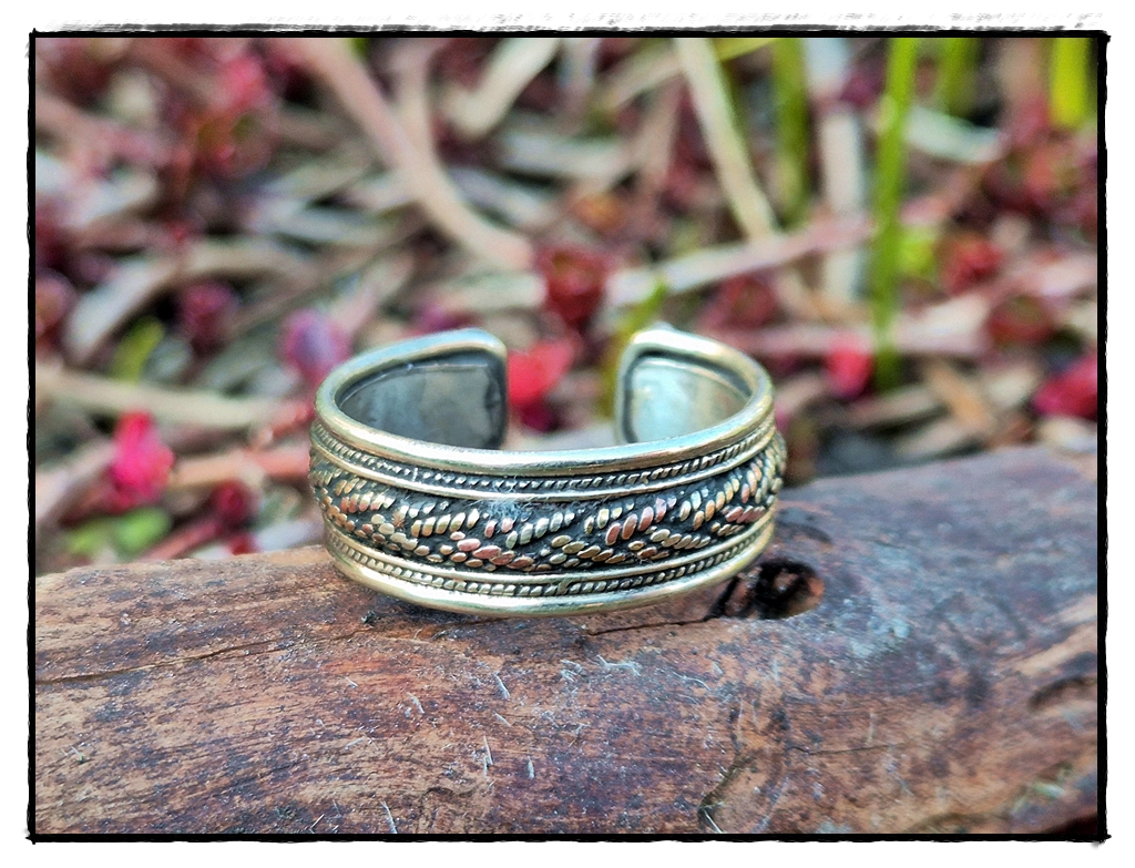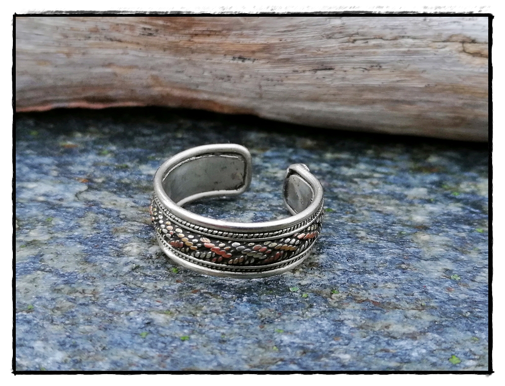 Verstellbarer Ring mit Flechtmuster aus drei Metallen.