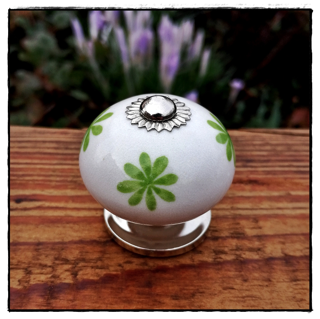 Handbemalter Schrankgriff weiß mit grünen Blüten und Rosette in der Mitte. Das Dekor der Möbelgriffe aus Keramik spiegelt die farbenfrohe Verspieltheit indischer Handwerkskunst wider.